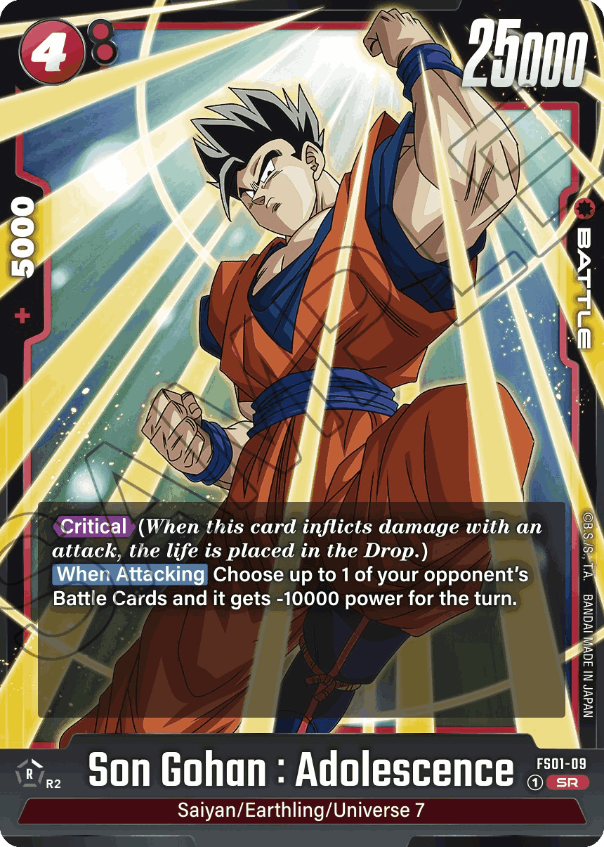 Son Gohan: Adolescence FS01-09 is your second Super Rare card in the Son Goku Starter Deck for DBS Fusion World. He has a Power level of 25000 and has the “Critical” effect. When this card inflicts damage with an attack, the life is placed in the Drop and won’t go into the opponent’s hand. When you attack your opponent, choose up to one of your opponent’s Battle Cards, and it gets -10000 power for the turn. This is great if combined with Son Goku FS01-08. And this can be used every time Son Gohan attacks.