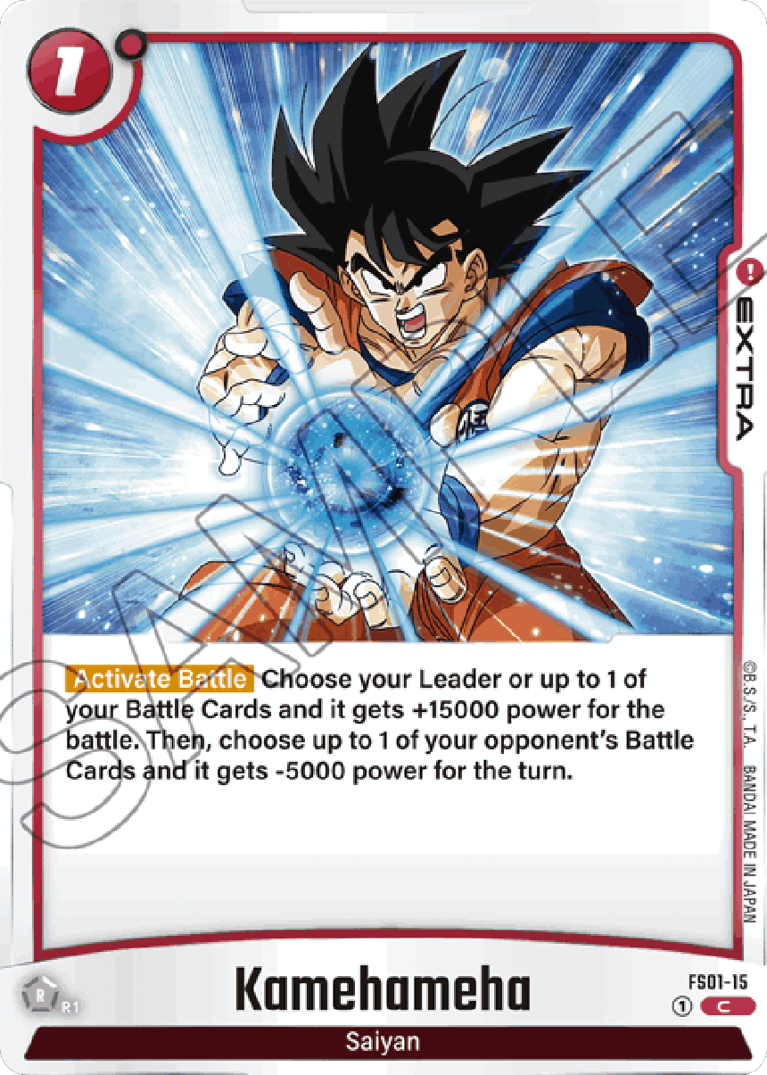 Kamehameha FS01-15 is an “Extra” type card. Choose your Leader or one of your battle Cards, and it gets +15000 power for the battle! Additionally, you get to select one of your opponent’s Battle Cards, and it gets -5000 power for the turn!