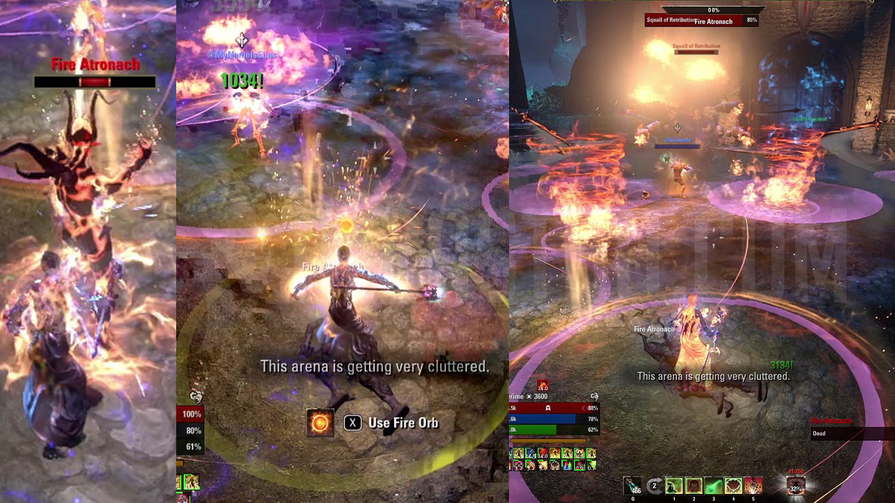 Fire Atronach: Fire Atronachs spawn when Squall of Retributions health reaches 95%, 90%, 80% and 70%. Killing a Fire Atronach spawns a Fire Orb on its location that a player needs to pick up by using the synergy button. You can push the boss and get all four Fire Atronachs at the same time, or damage the boss slower and deal with one Atronach at a time.