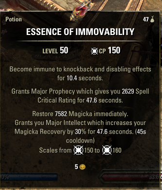 There are two options here.  Primarily, you want to use Potion of Immovability for the stun resistance when engaging a target, and the added Crit Chance.  If you are starting out or struggling in a fight you may opt for a Tri-Stat Potion for additional sustain (Stamina Regen) or heal to help recover in a fight.