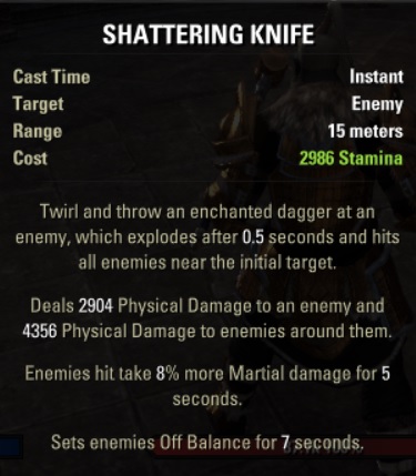 • Traveling Knife: This will be used after debuffing a target with Wield Soul and before you start using Wrecking Blow.  This will off balance a target and allow you to medium attack after your wrecking blow to weave in an execute on the target, or a Dawnbreaker.