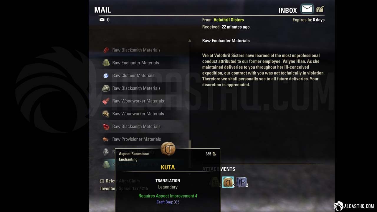 Enchanting send crafting materials to your mailbox every 12-24 hours. This is true set-and-forget ESO gold farming.