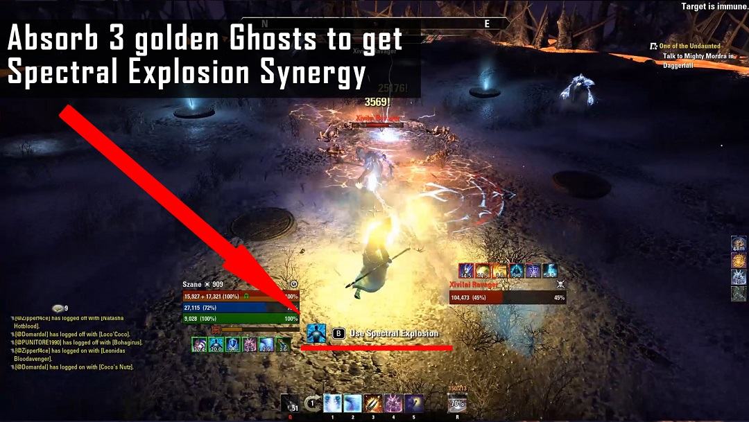 (If the boss catches three golden ghosts himself, he will start his “ultimate” attack; a storm will cover the whole arena and you will get a massive DoT from Voriak Solkyn’s “soul churn” ability, that’s the same damage over time you got while being upstairs killing the crystals. This time, the damage is a lot higher though, there is no way to survive this longer than a few seconds.)