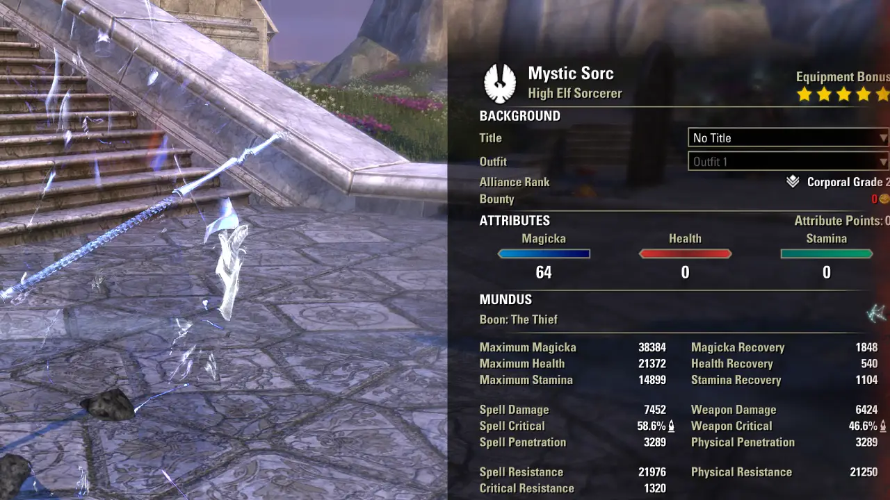 5x Perf. Whorl of Depths, 5x Pillar of Nirn, 1x Slimecaw, 1x Velothi Ur-Mage’s Amulet on a High Elf with Ghastly Eye Bowl buff food.