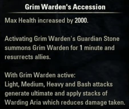 You will enter an arena and be greeted by the ghost Vitellia Laenius. She tells you to activate a specific crystal by lighting the braziers in order to call the miniboss. This miniboss has very hurtful attacks. They will be cast on anyone that has aggro and especially the spinning blade one will kill any unprepared tank. The boss can also call upon Air Atronachs and a whirlwind. The Air Atronachs need to be killed in order for it to loose the buff it gets by the additional adds. The buff you will get is the following: Grim Warden’s Accession – Max Health increased by 2000. Activating Grim Warden’s Guardian Stone summons Grim Warden for 1 minute and resurrects allies. With Grim Warden active: Light, Medium, Heavy and Bash attacks generate ultimate and apply stacks of Warding Aria which reduces damage taken.