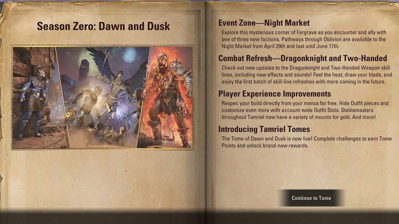 The Tome of Dawn and Dusk is the first Tamriel Tome in Elder Scrolls Online, launching with Season Zero on April 2, 2026. This page lists all rewards found on the Tome of Dawn and Dusk Pages, including Tome Point costs for both the free and premium tracks.