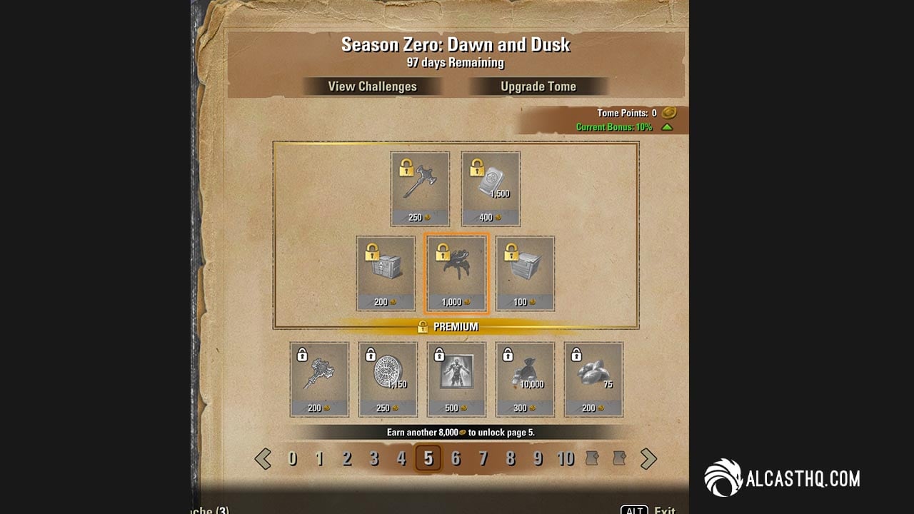 - Each page has 5 free track rewards and 5 premium track rewards that you purchase individually with Tome Points.