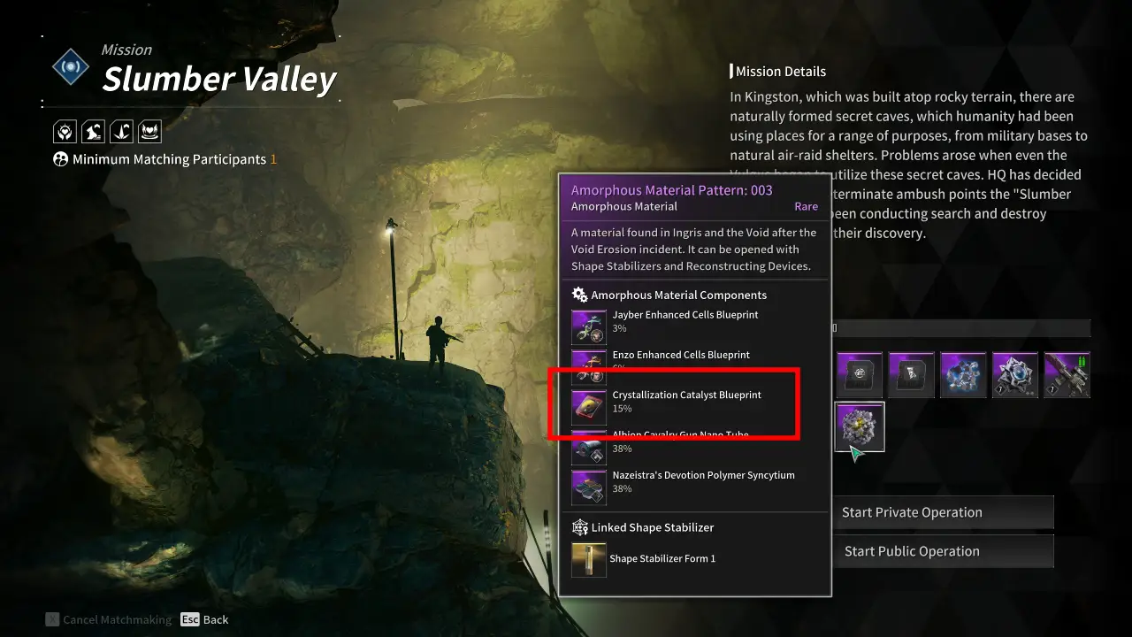 The Blueprint for the Crystallization Catalyst is the toughest item to farm out of all. You want to farm the Slumber Valley Infiltration mission on normal to speedrun through it and obtain Amorphous Material Pattern: 003. One run should only take you a few minutes if you are able to clear it fast. I recommed farming 10 Ammorphous Material 003. Then visit Gravewalker Colossus on normal mode and open all the 003 Amorphous Materials. The Blueprint has a 15% drop chance.