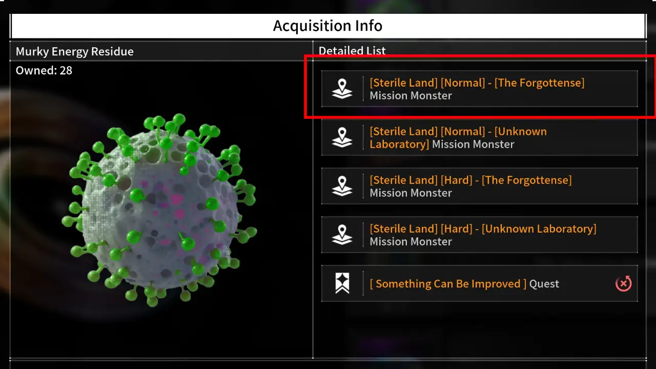 | Murky Energy Residue | 8 | Fast | Sterile Lands Normal: The Forgottense Infiltration, mid-boss (Private operation, leave after killing) |