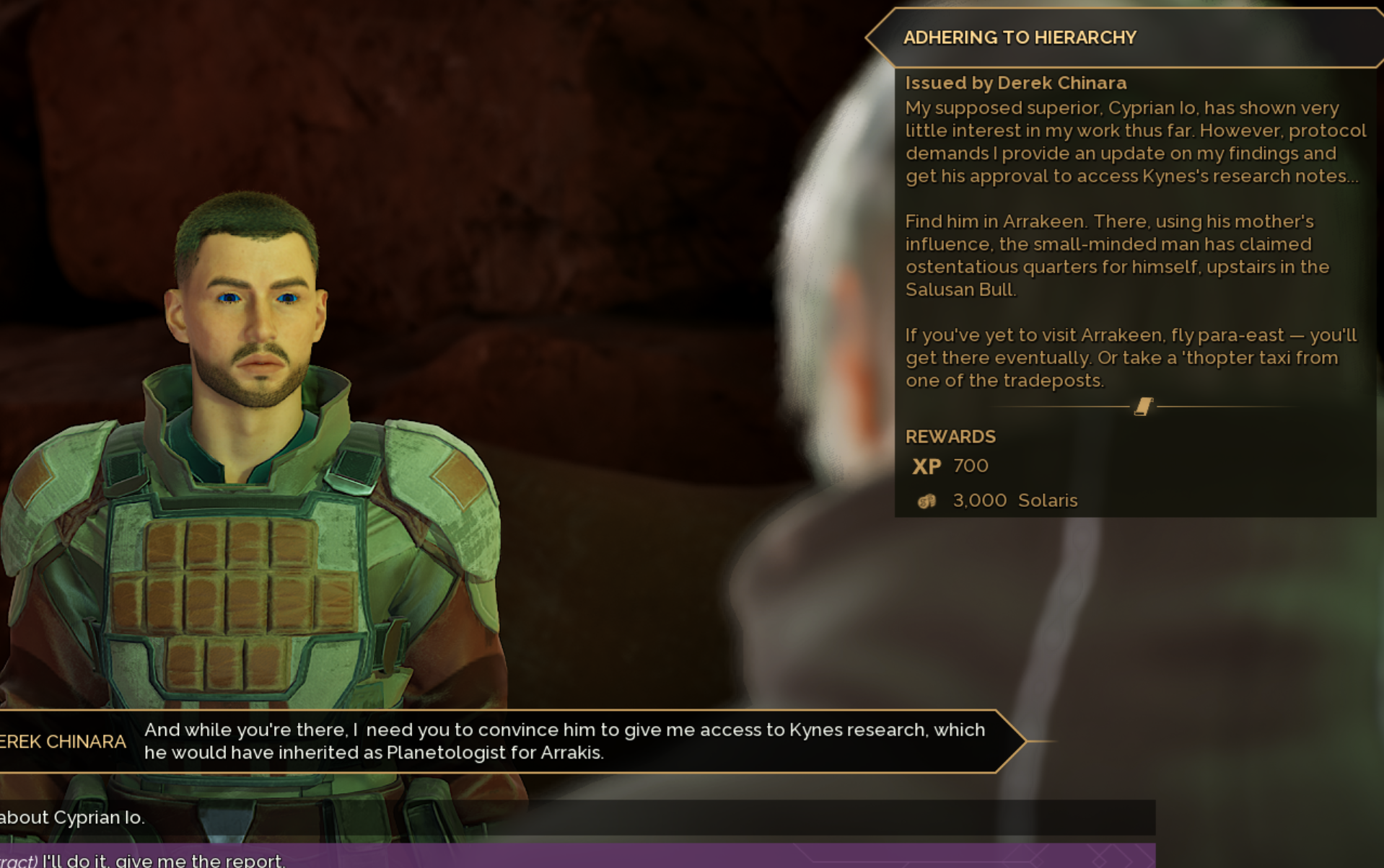 Derek will be requesting us to travel to Arrakeen to speak with Cyprian Io once again.