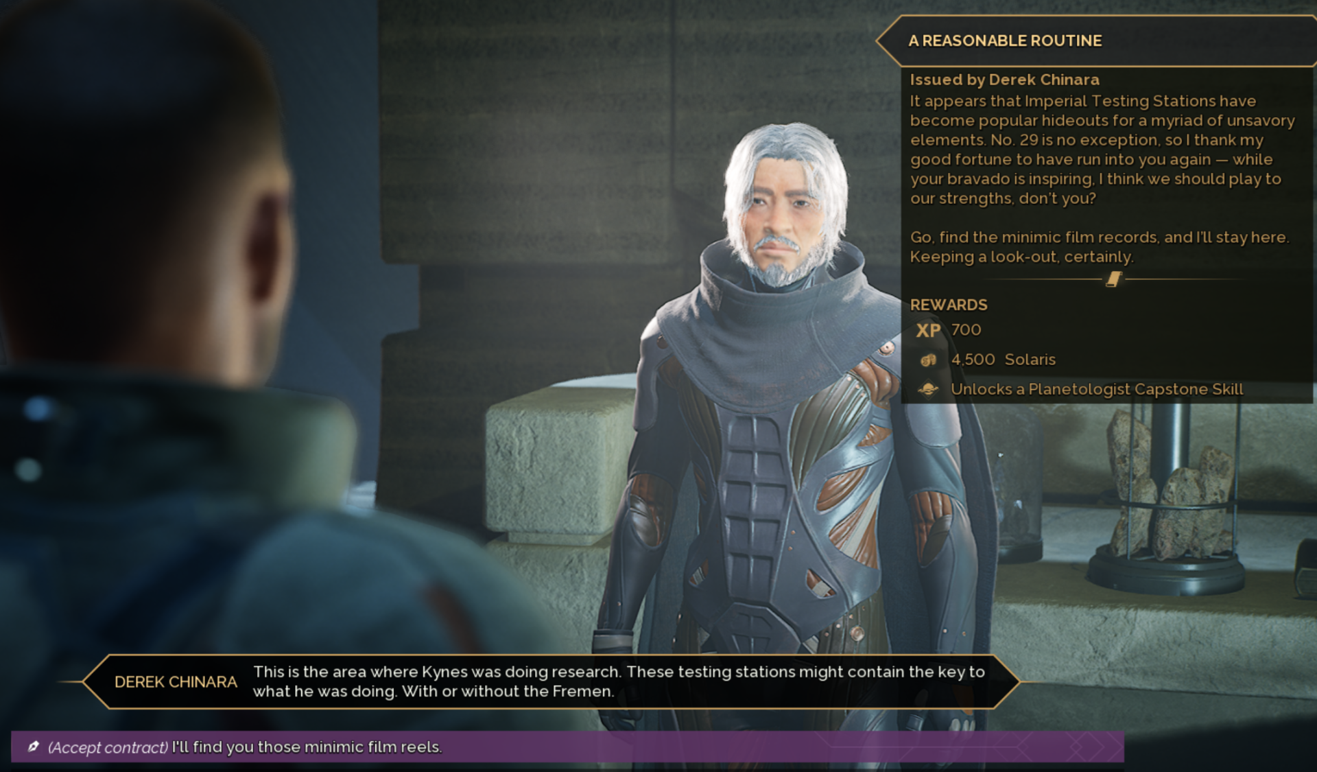 Once you’ve returned the Minimic Film and Kyne’s Research to Derek at the entrance, you will also need to fly back to his original spot at Station No. 2 in Hagga Basin. Once you’ve completed discussions with him, he will train you.