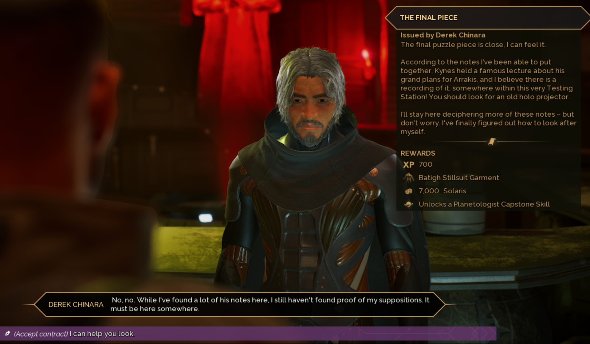 You will receive the final teaching from Derek and unlock the final capstone skill. Additionally, he will reward you with a unique stillsuit.
