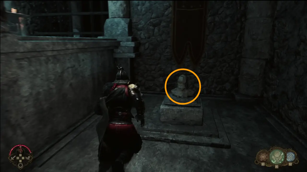 First, go all the way to the rear-right corner of the room. You will find a stone bust on a pedestal. Pick it up and carry it to the pedestal next to the locked door on the right side of the room. There are a few lit candles on the pedestal, making it easier to find.