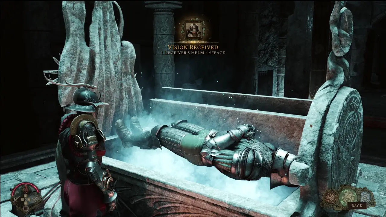 Please note that the braziers and mosaics above can be activated in a different order from what is written above. Once all three mosaics are revealed, return to the caged coffin in the middle of the room. The cage will be moved away, allowing you to open the coffin. Do this, and a small cutscene will play out, after which you will receive the full Circade armour set. Unlike most armour sets in Soulframe, you do not need to craft them. You can go straight to your armoury in Nightfold and equip them from there.