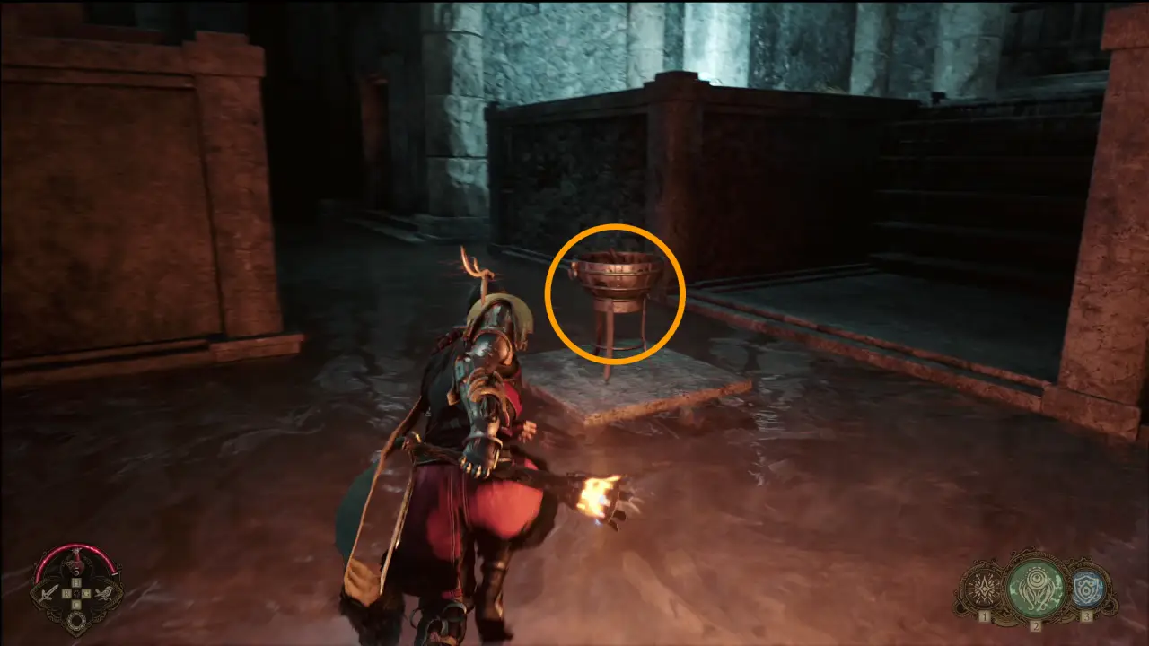 There are several braziers to light in the large room, each of which will unlock a door. Take a careful look around the room and make sure you light all of them – if you miss one, it might cause confusion later on.