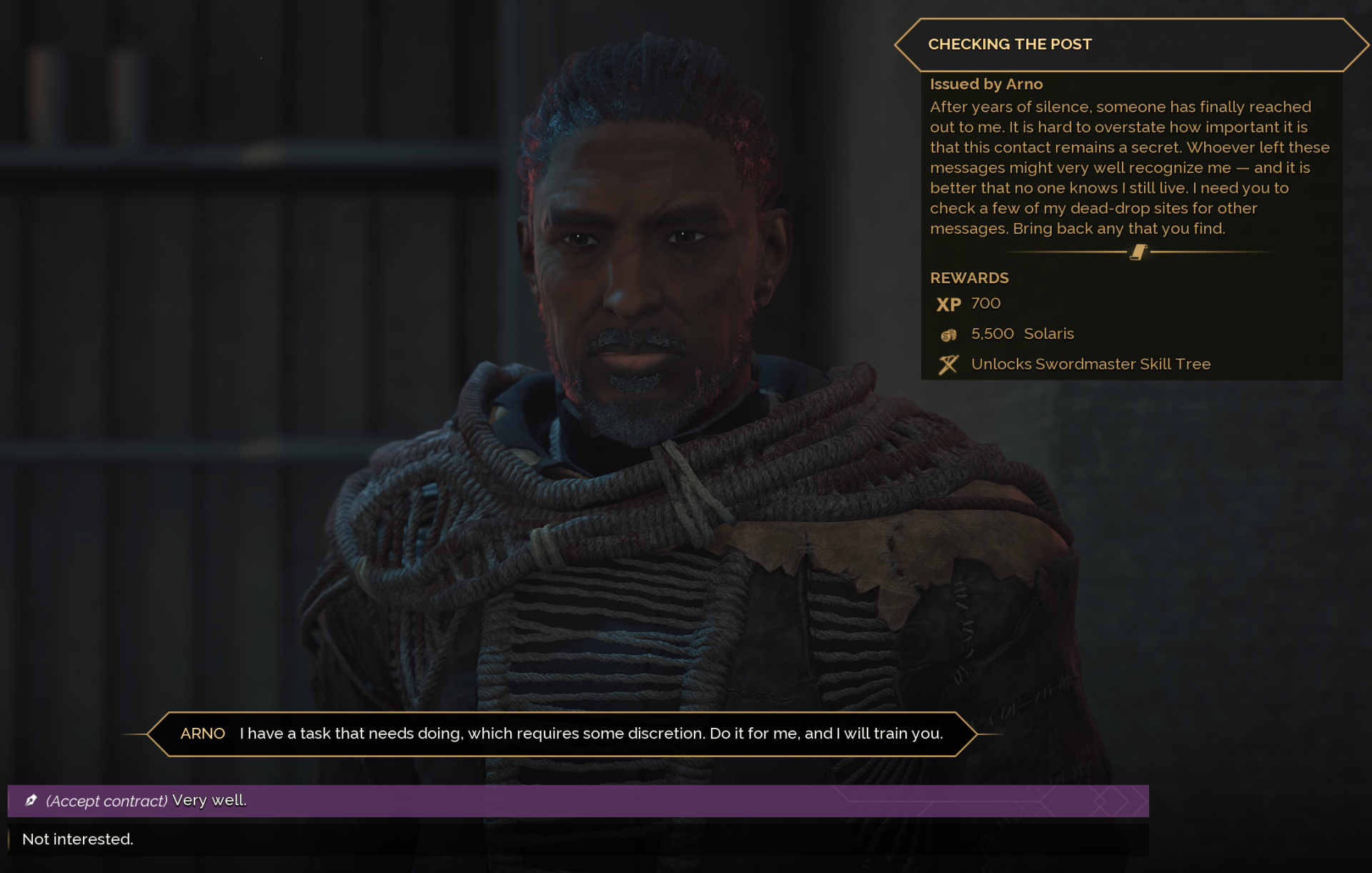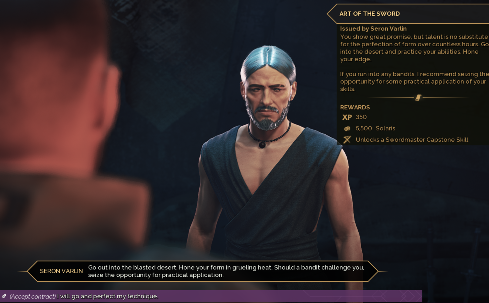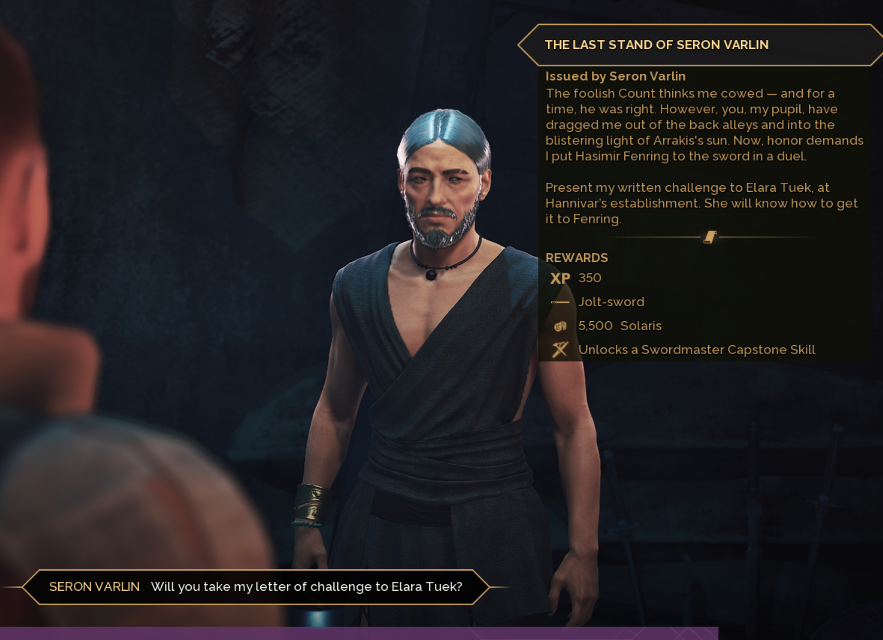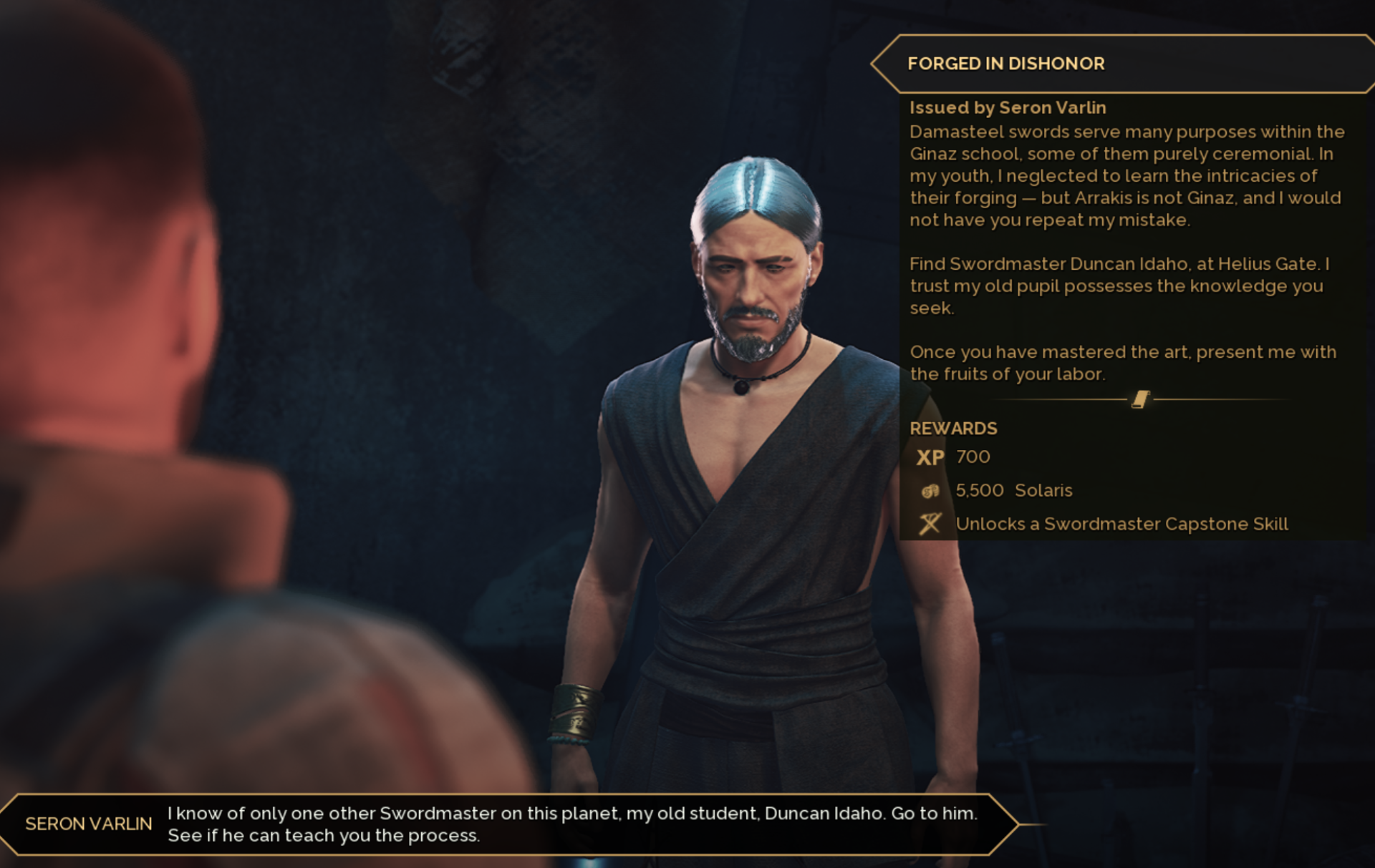 Our final quest will be a delivery of a letter to Fenring’s associate for a duel. We must go to Hannivar’s bar in the back room to deliver this request. After turning in the letter, we need to simply return to Seron Varlin and convince him not to do the duel. Afterwards, he will thank us and teach us his final technique.