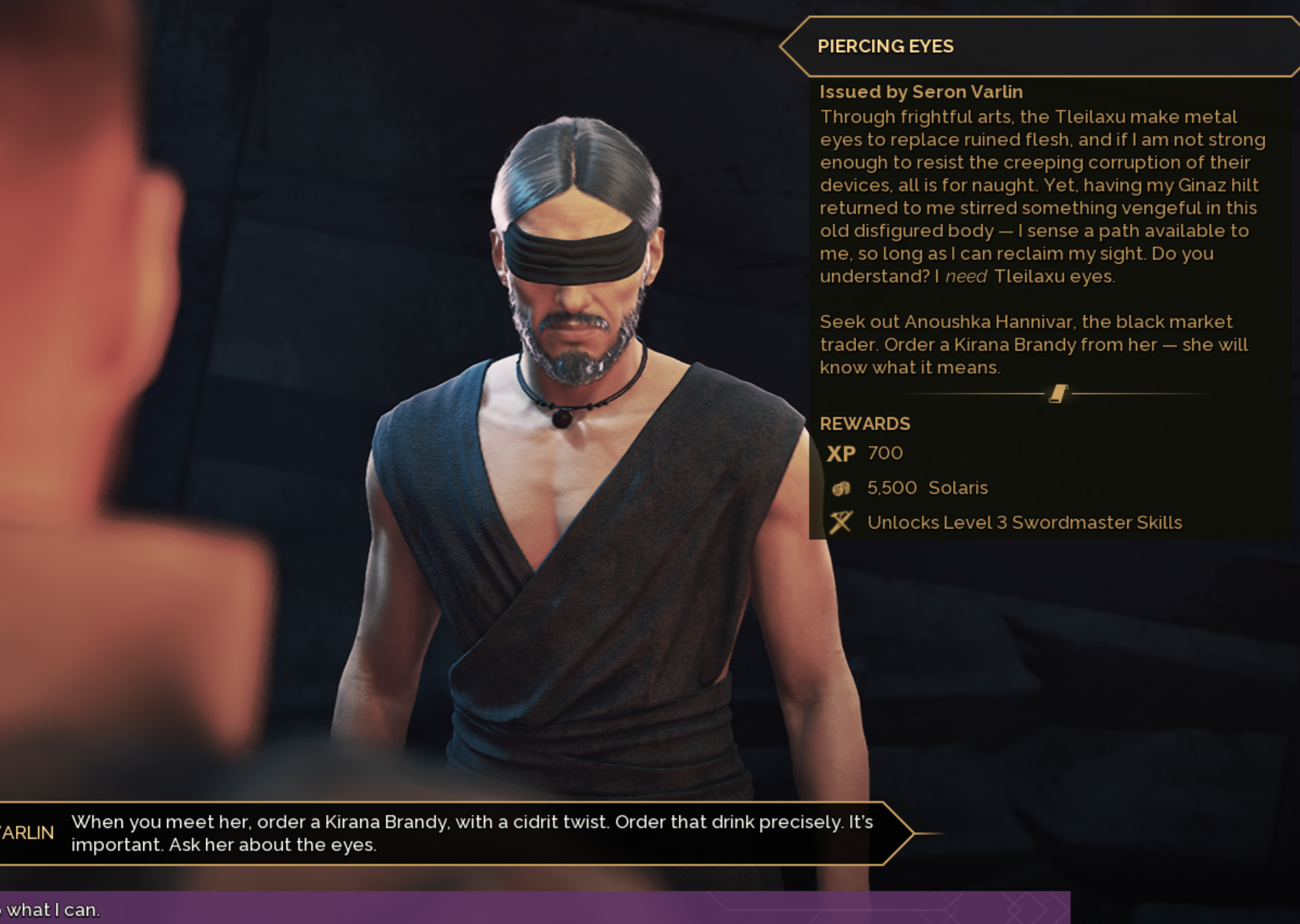 Next up Seron Varlin will have you head to the bar again to get information from the black market trader, Anoushka Hannivar. You must order a “Kirana Brandy with a cidrit twist” as a code line to discuss details with her.