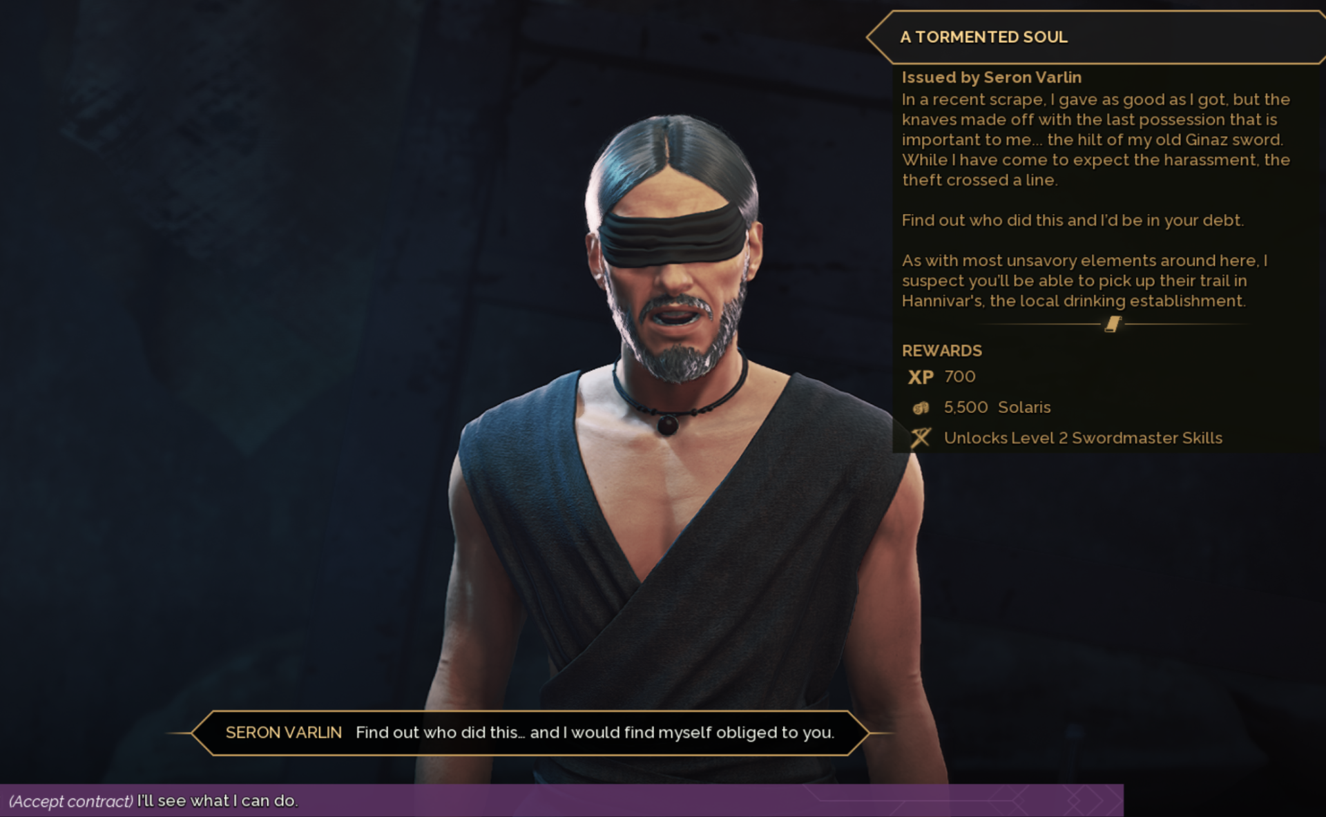Speak with Seron Varlin and he will direct us to collect information on his lost blade from the bar, Hannivar’s. You’ll find a contract leading you to speak with Elara Tuek who is located in the back room of the bar. She will point out where to find who hired her, the Sandflies. Report back to Seron before departing and he will ask you to retrieve his sword hilt from the Western Comms Sandfly Base.
