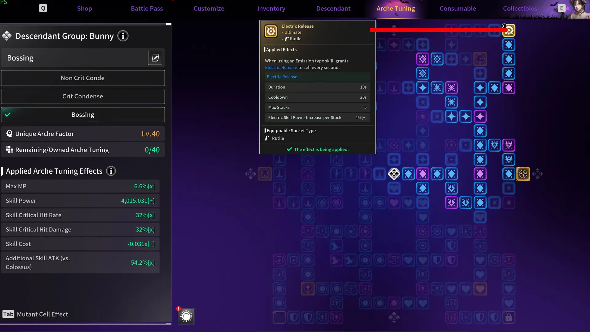 This build uses the Bunny-exclusive Electric Condense Transcendent Module that changes Maximum Power (4th Skill) into Electric Condense. This deals AoE damage around Bunny and also increases her running speed. After that, we amp up our damage and range as much as possible for maximum damage against tough monsters with the remaining modules.