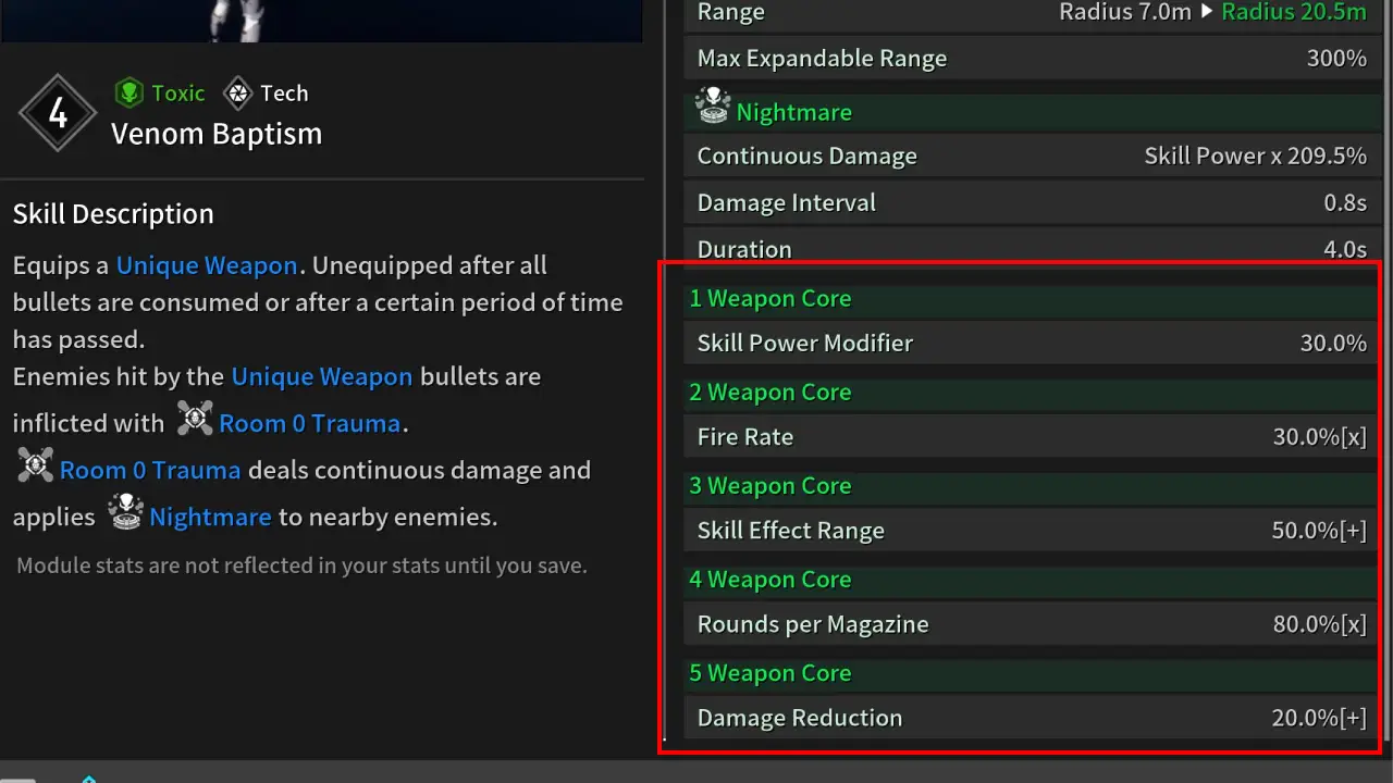 Changes current Firearm to Venom Baptism. Enemies hit with Venom Baptism bullets are inflicted with Room 0 Trauma. Room 0 Trauma applies Nightmare to nearby enemies.