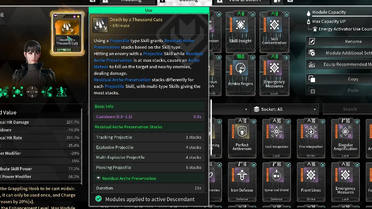 Additionally, you can use an Energy Activator to increase your Module Capacity by another 20. However, these are fairly hard to farm, only use them on your best Descendants.