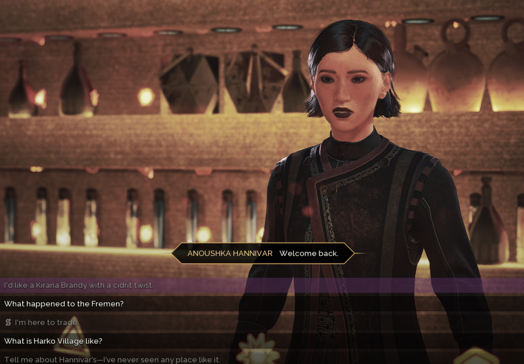 After returning the Transmitters Kara will tell you they didn’t work. Speak with her a few times and you will get the next quest, Regaining Control. This will first send you to meet Hannivar, the black market trader at Harko Village. After traveling to the black market and seeing the trader is not there, you must go to the bar and tell them “I’d like a Kirana Brandy with a cidrit twist.”