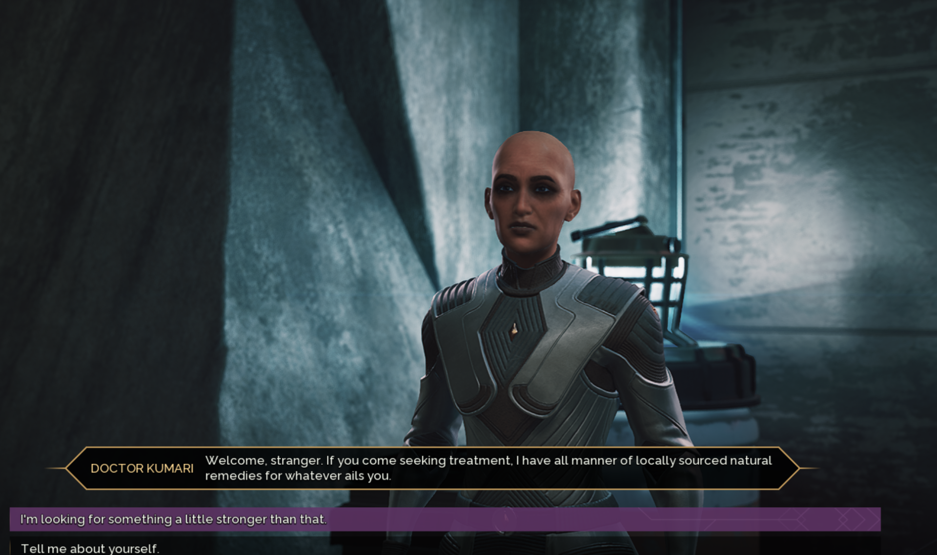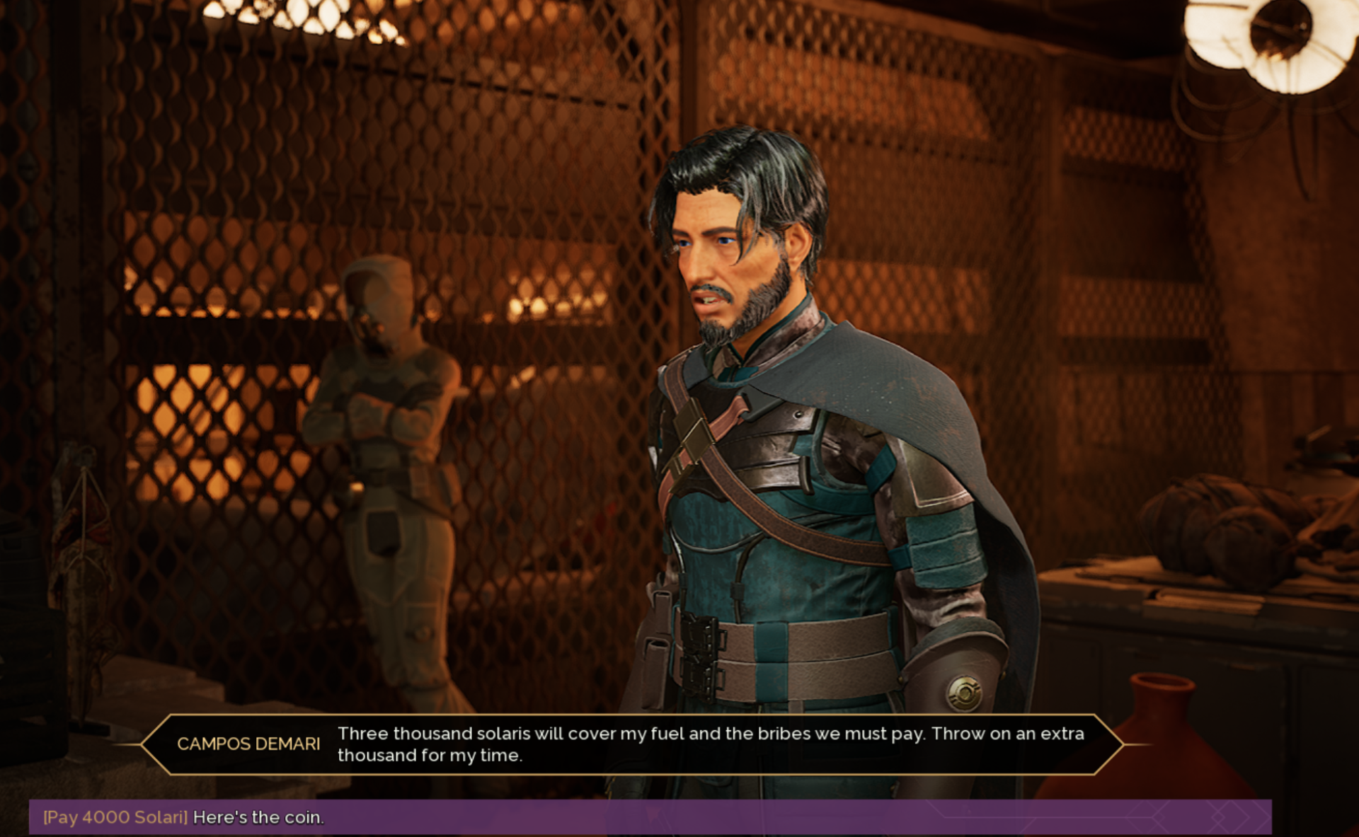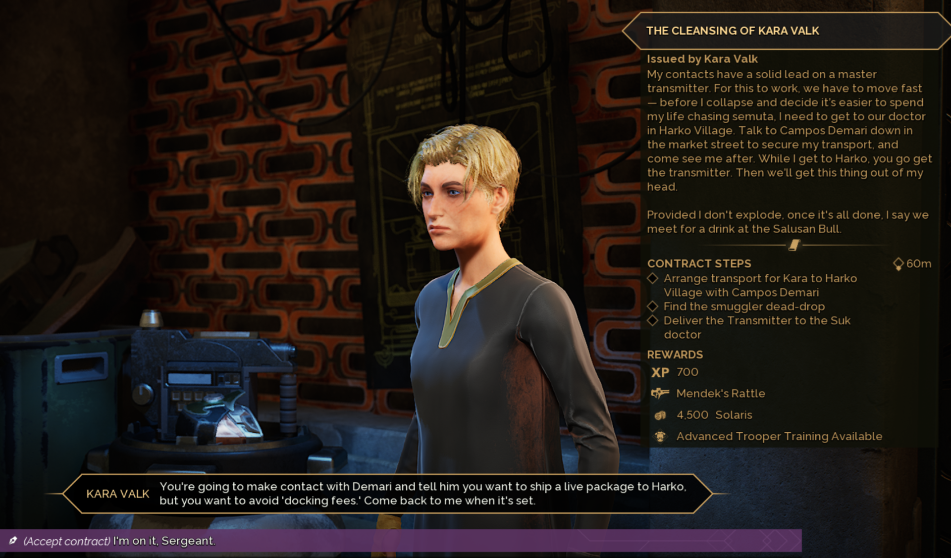 Once you arrive in Arrakeen, you will need to go upstairs and look for a former Trooper named Kara Valk (2). You will have to choose “Come on, trooper. It can’t be as bad as all that.” to activate the conversation to open this quest up. After a bit of conversation, you’ll be issued a quest, Seeking Control.