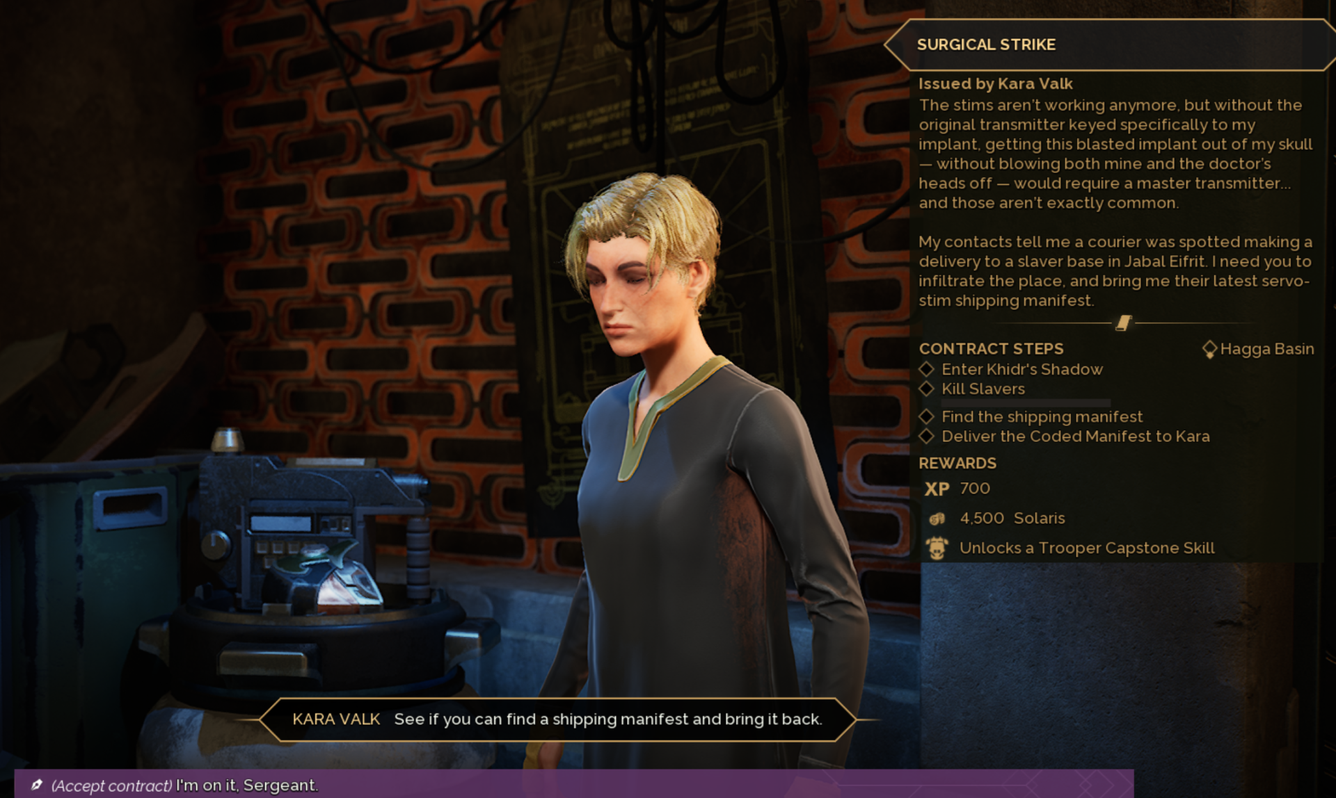 This will earn Kara Valk’s trust, though you won’t gain any Trooper levels on this quest.